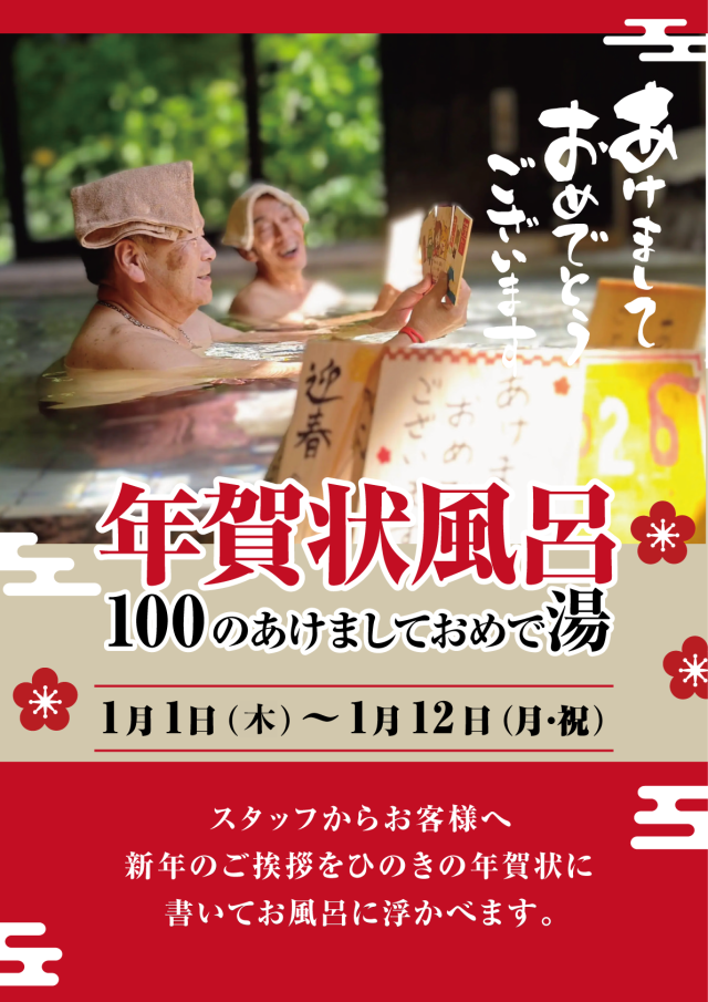 info2025.12.28 【年賀状風呂】イベントのお知らせ 1月1日(水)~1月12日(月)は年賀状風呂を開催致します。 スタッフからの新年のご挨拶を書かせていただいた檜プレートを浴槽に浮かべます。 前の記事 一覧に戻る 次の記事 全国のおふろcaféofuro café group 埼玉県さいたま市おふろcafé utatane 埼玉県熊谷市おふろcafé ハレニワの湯 静岡県静岡市おふろcafé 美肌湯 埼玉県児玉郡おふろcafé 白寿の湯 三重県四日市市おふろcafé 湯守座 北海道芦別市おふろcafé 星遊館