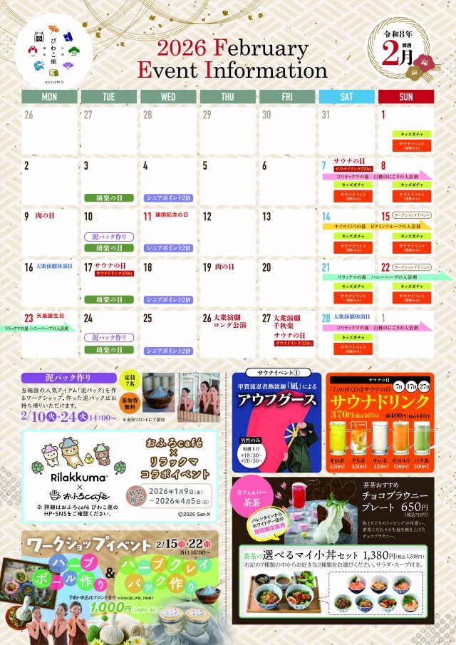 info2026.01.31 2月イベントインフォメーション 〇2月イベントインフォメーション 前の記事 一覧に戻る 全国のおふろcaféofuro café group 埼玉県さいたま市おふろcafé utatane 埼玉県熊谷市おふろcafé ハレニワの湯 静岡県静岡市おふろcafé 美肌湯 埼玉県児玉郡おふろcafé 白寿の湯 三重県四日市市おふろcafé 湯守座 北海道芦別市おふろcafé 星遊館