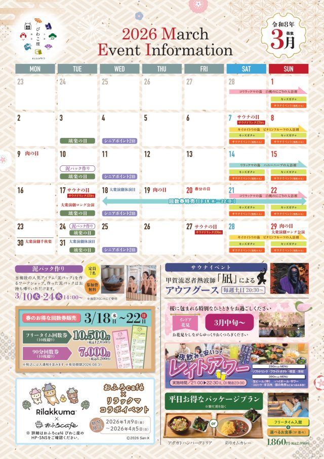 info2026.02.26 3月イベントインフォメーション 〇3月イベントインフォメーション 前の記事 一覧に戻る 次の記事 全国のおふろcaféofuro café group 埼玉県さいたま市おふろcafé utatane 埼玉県熊谷市おふろcafé ハレニワの湯 静岡県静岡市おふろcafé 美肌湯 埼玉県児玉郡おふろcafé 白寿の湯 三重県四日市市おふろcafé 湯守座 北海道芦別市おふろcafé 星遊館